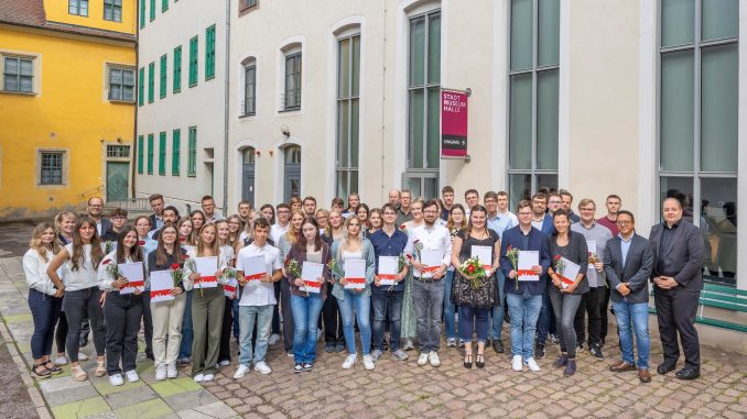 Halle. PSt. Zum Start des Ausbildungsjahrs hat die Stadt Halle (Saale) am heutigen Freitag, 1. August 2025, neue Auszubildende sowie duale Studierende begrüßt. Bei der feierlichen Veranstaltung im Stadtmuseum wurden zudem Absolventen nach erfolgreichem Abschluss ihrer Ausbildung bzw. des dualen Studiums in der Stadtverwaltung Halle verabschiedet beziehungsweise als neue Fachkräfte (Saale) willkommen geheißen. Der Beigeordnete für Stadtentwicklung, Umwelt und Sicherheit, René Rebenstorf, begrüßte für die Verwaltung die Anwesenden.