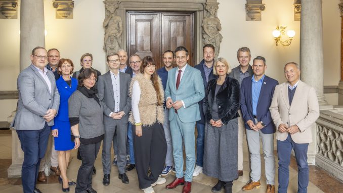 Auf Einladung von Oberbürgermeister Dr. Alexander Vogt (Mitte) haben Vertreterinnen und Vertreter aus Wirtschaft, Stadtverwaltung, Kammern, Banken und Netzwerken eine Initiative für mehr Gründergeist und eine lebendige Innenstadt gebildet. Foto: Thomas Ziegler / Stadt Halle.