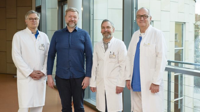 Die diesjährige Ausgabe der FOCUS-Ärzteliste zeichnet vier Chefärzte des Krankenhauses St.Elisabeth und St. Barbara auf verschiedenen Fachgebieten aus (v.l.n.r.): Dr. med. Tilmann Lantzsch(Frauenheilkunde), Dr. med. Constantin Puy (Psychosomatische Medizin und Psychotherapie), PD Dr.med. Daniel Schubert (Allgemein-, Viszeral- und Tumorchirurgie), Dr. med. Sven Seeger(Geburtshilfe). Foto: Krankenhaus St. Elisabeth und St. Barbara / Andrea Bergert.