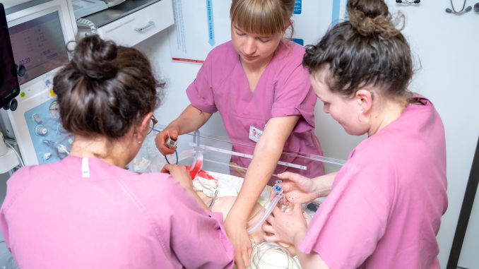 Halle. UMH. Wenn während der Geburt ein medizinischer Notfall eintritt, ist schnelles und sicheres Handeln gefragt, um Mutter und Baby gesund durch die Krise zu begleiten. Deshalb trainieren Hebammen und Ärzt:innen der Geburtshilfe und der Gynäkologie mehrmals im Jahr das Vorgehen sowie die interprofessionelle Zusammenarbeit in Notfallsituationen. Sechs bis acht Termine werden pro Jahr angeboten, damit das gesamte Team der Universitätskliniken und Polikliniken für Geburtshilfe und Pränatalmedizin sowie für Gynäkologie der Universitätsmedizin Halle diese Pflichtübung absolvieren kann.