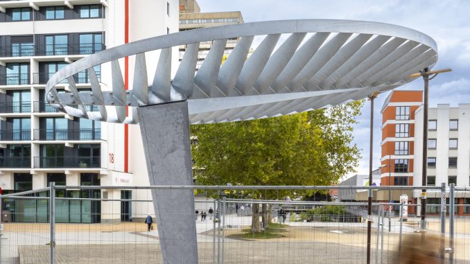 Halle. PSt. Die erste „Reißzwecke“ der Kunstinstallation „500:1:1:500“ wird aktuell zwischen Neustadt-Centrum und dem Stadtverwaltungsgebäude „Scheibe A“ in Neustadt montiert. Die Installation der Künstler Michael Krenz und Martin Schwand hatte 2023 die Fachjury des Kunstwettbewerbs überzeugt, der im Rahmen der „Richtlinie der Stadt Halle (Saale) zur Kunst am Bau“ für das Stadtteilzentrum Neustadt durchgeführt wurde. In der bisherigen Planung sind sieben große und drei niedrigere Reißzwecken vorgesehen, die als Schattenspender und Sitzelement den großen Platz in Neustadt schmücken. Die Plastiken, gefertigt aus feuerverzinktem Stahl, Holz und Beton, sollen nach Angaben der Künstler ein Sinnbild für die Planstadt Neustadt verkörpern. Die Reißzwecke symbolisiert dabei die Variabilität und Herausforderungen der Stadtplanung.