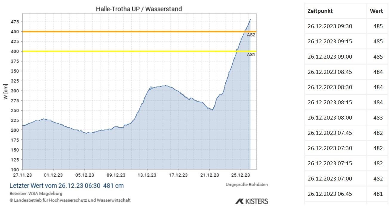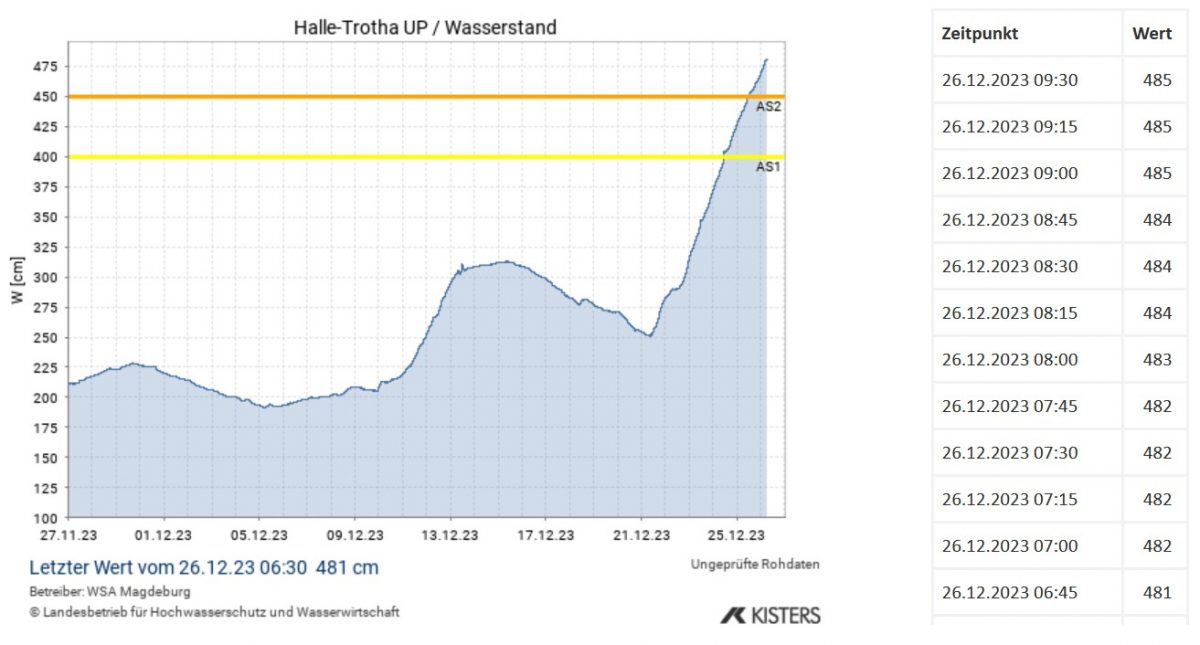 Das Hochwasser der Saale in Halle steigt nicht so stark wie erwartet. Der in den Morgenstunden des zweiten Weihnachtstags erwartete Höchstpegel von 5,30 Metern wurden nicht erreicht. 9.30 Uhr lag der Unterpegel in Trotha bei 4,85 Metern. Die Alarmstufe 3, welche ab 5,50 Metern aktiviert wird, ist damit nicht in Sicht.